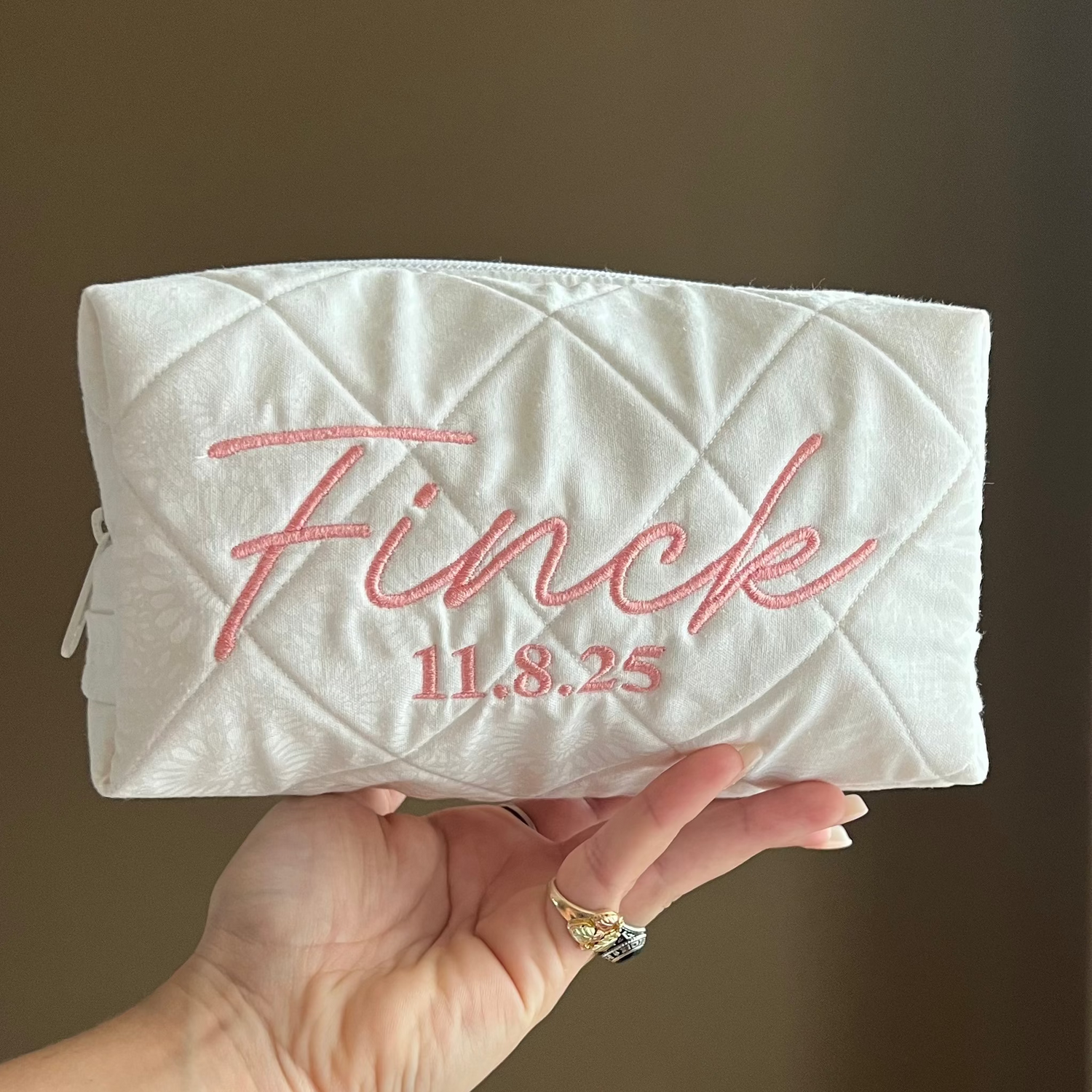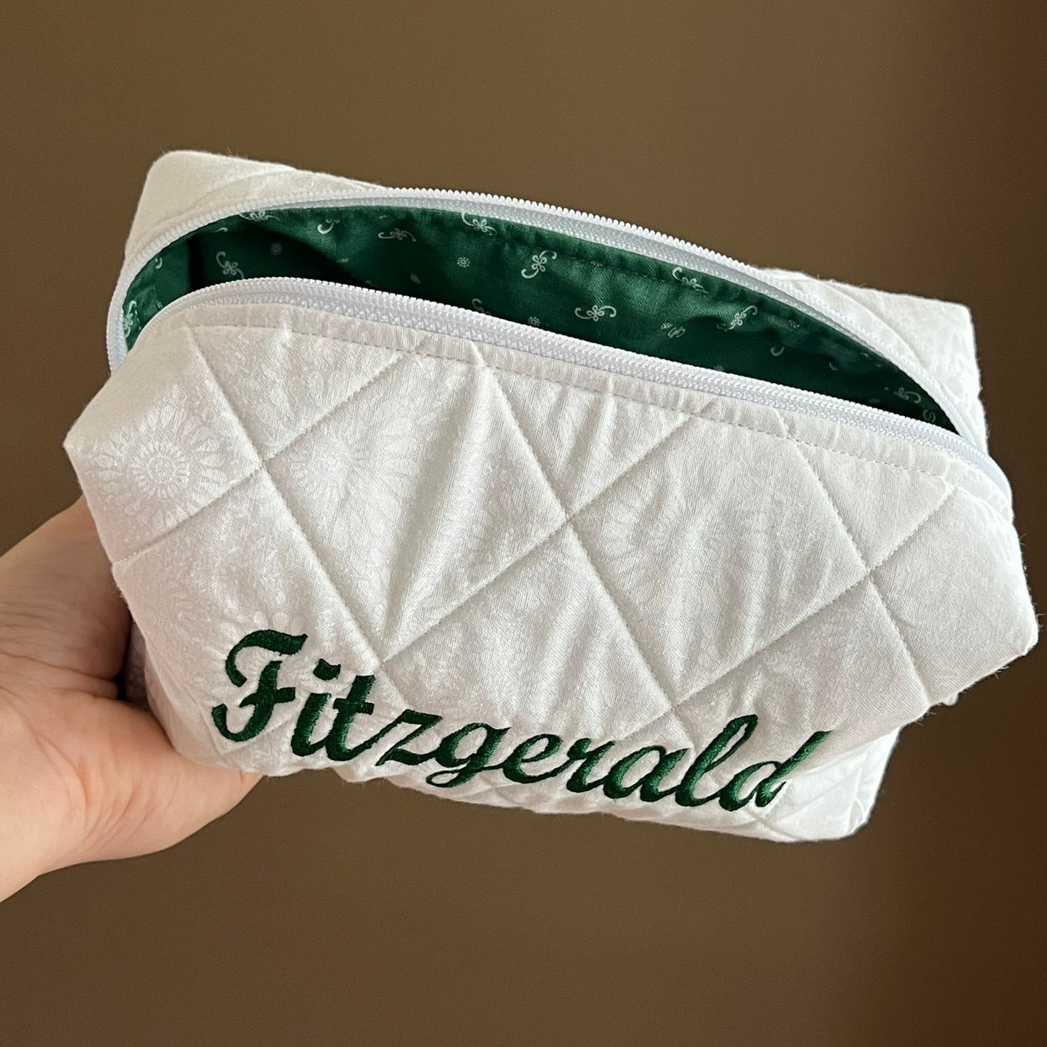 We created this beautiful custom Boxie with a client as an engagement gift! It features our tag on one side, their custom embroidery on the other, two handles on each side of the zipper for easy grabbing, and a special green interior per request! The thread is a deep emerald green color to compliment the interior.