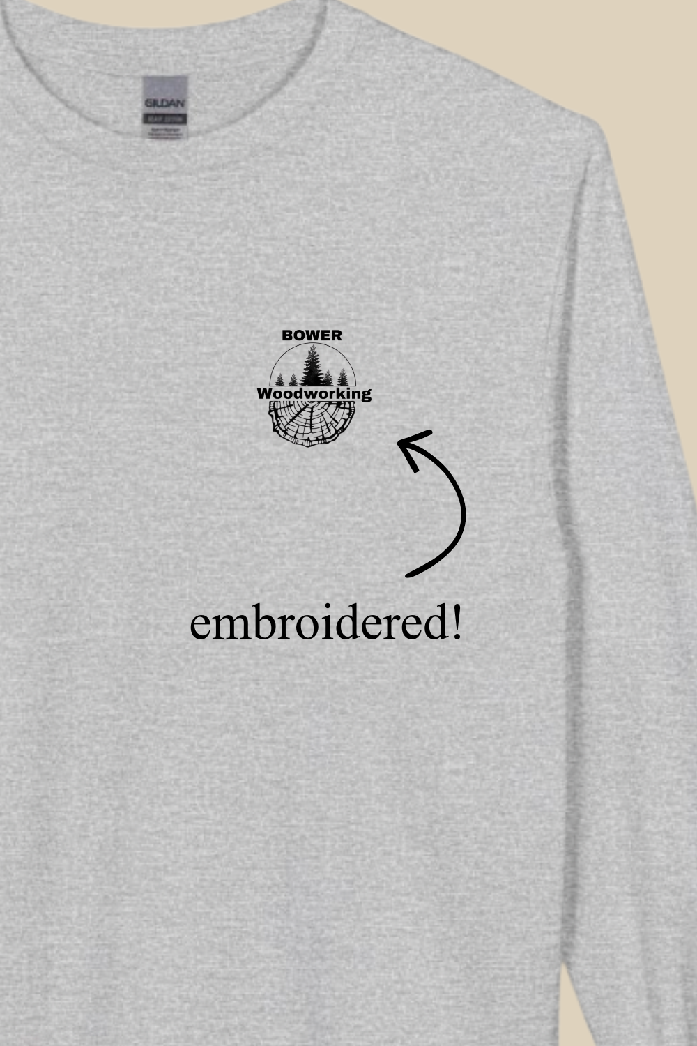 Support Bower Woodworking with a Classic Long Sleeve Tee featuring a bold printed design on the back and the brand logo embroidered on the left chest. 50% of the profit from each piece goes to the small businesses we create for!